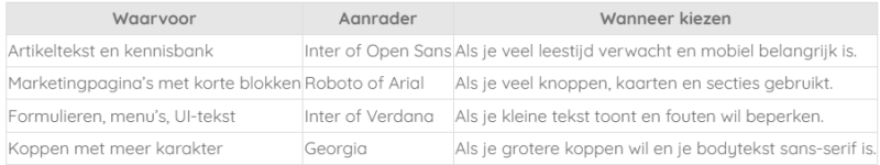 Je kiest een font niet alleen op naam. Je kiest op taak. Deze tabel helpt je direct kiezen.